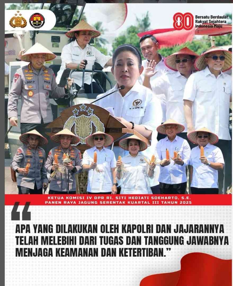 Ketua Komisi IV DPR RI, Siti Hediati Soeharto, S.E., dalam kesempatan tersebut menyampaikan rasa hormat dan penghargaan kepada Kapolri beserta jajaran, yang dinilainya telah bekerja melampaui tugas serta tanggung jawab dalam menjaga keamanan dan ketertiban masyarakat.